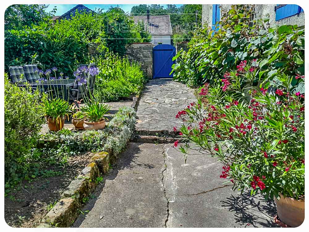 Authentieke elementen in de tuin: Ommuurde voortuin met statige poort. Mooie oude bomen in de tuin.