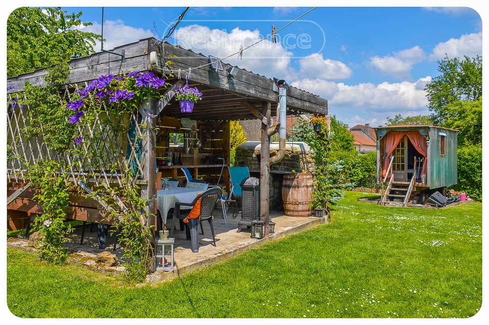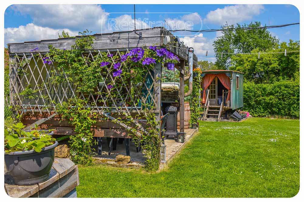 Bijgebouw: Tuinhuisje en een Pipowagen met ruimte voor tweepersoonsbed.